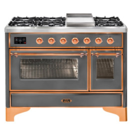 Тип комбинированный варочный центр Цвет корпуса матовый графит Цвет фурнитуры медь Количество духовок 2 духовки Тип варочной поверхности газовая..