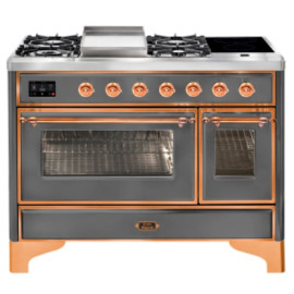 Тип комбинированный варочный центр Цвет корпуса матовый графит Цвет фурнитуры медь Количество духовок 2 духовки Тип варочной поверхности газовая..