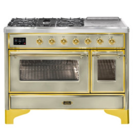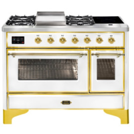 Тип комбинированный варочный центр Цвет корпуса белый Цвет фурнитуры латунь Количество духовок 2 духовки Тип варочной поверхности газовая, индук..